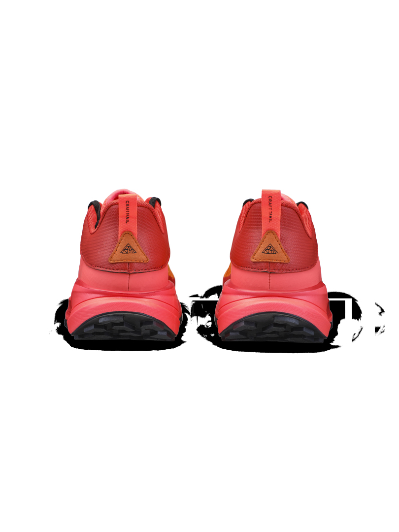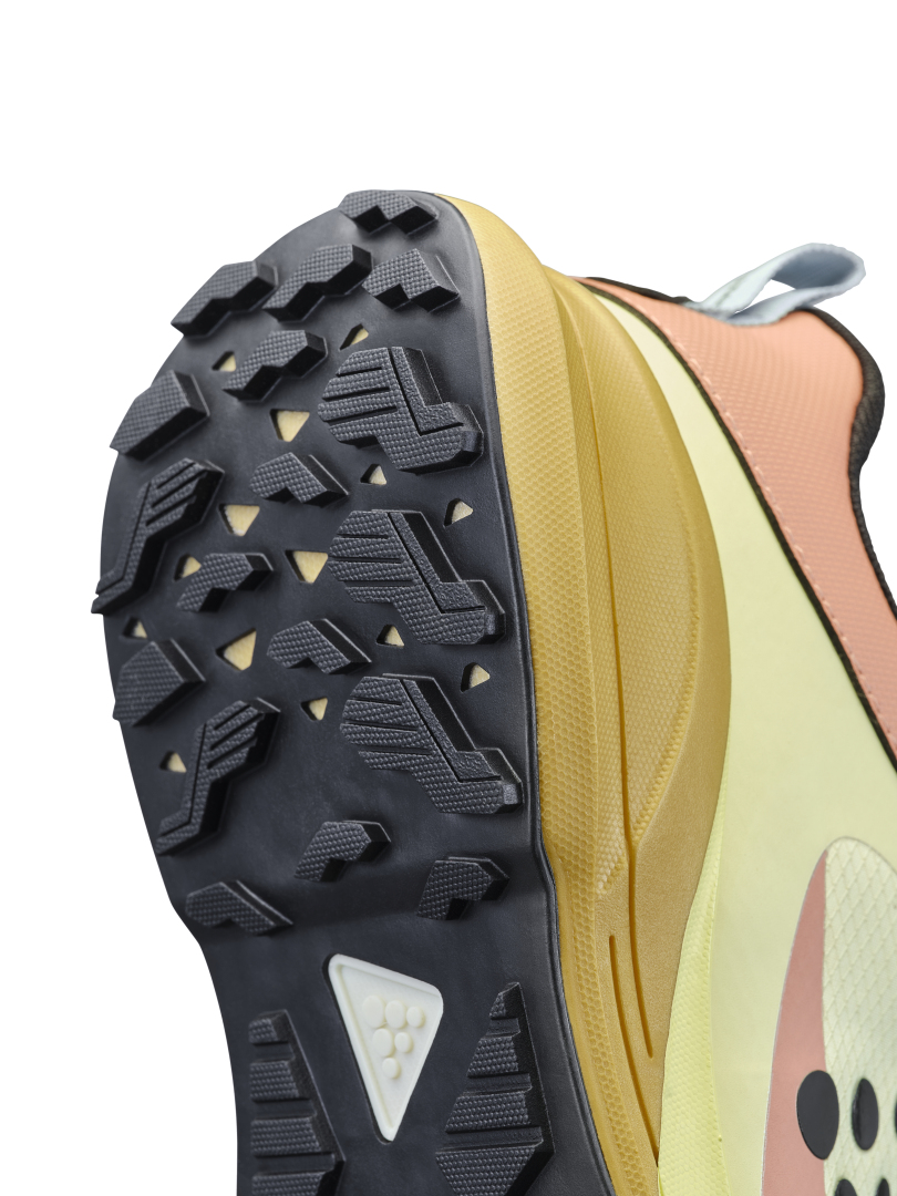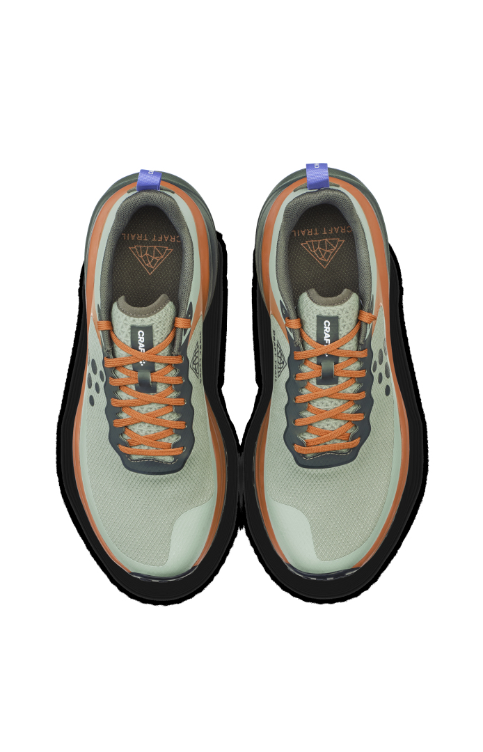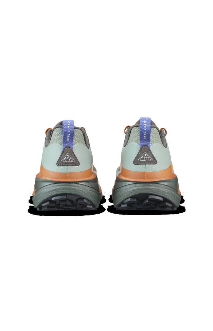 Trailová běžecká bota CRAFT Pure Trail X je vybavena Cr Foam™ (pěnou) v mezipodešvi, která poskytuje  vysokou míru tlumení, stabilitu, výbušný odraz a to vše se sníženou hmotností. Pod střední a přední částí chodidla je rock plate, který zvyšuje stabilitu a ochranu chodila. Podešev se středně vysokým vzorkem spolehlivě zdolává i náročnější terén bez ztráty trakce. Svrchní materiál je vyroben z recyklovaného polyesteru a má ripstopovou úpravu pro zvýšení odolnosti proti roztržení. Ještě větší odolnost přináší okop boty s TPU.