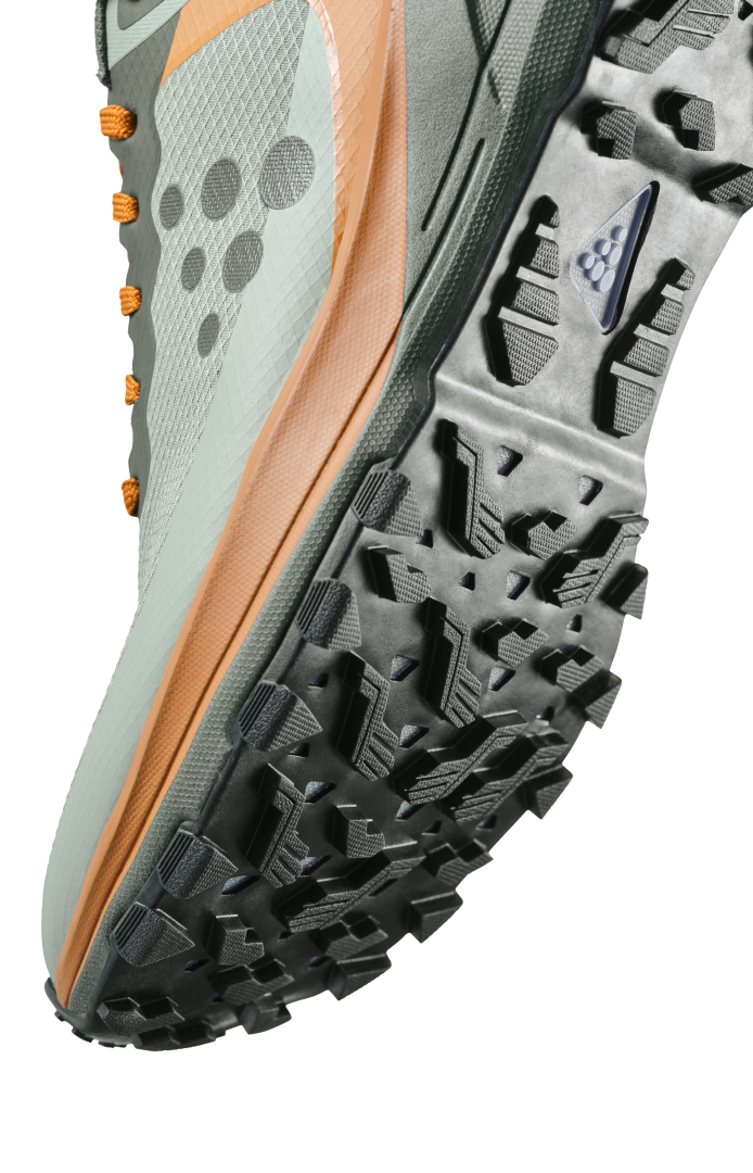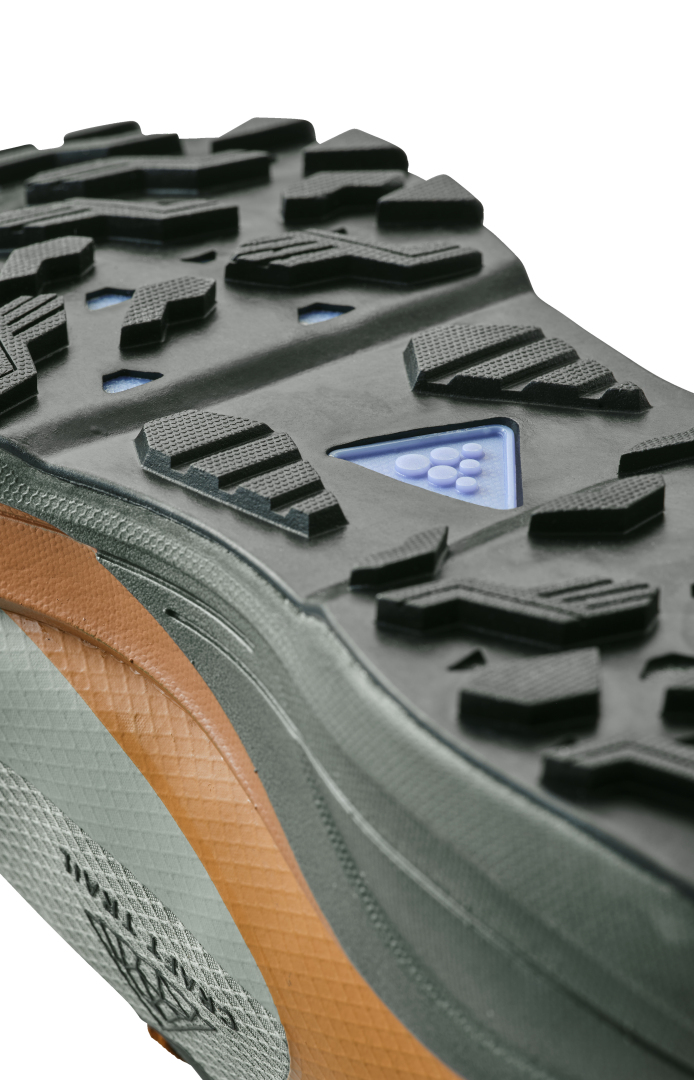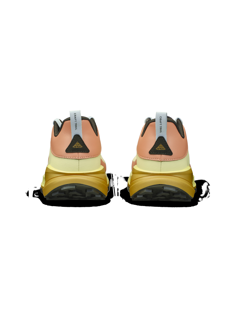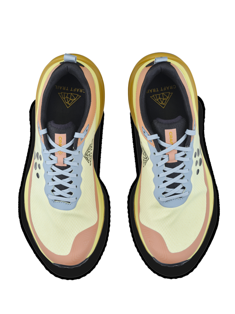 Trailová běžecká bota CRAFT Pure Trail X je vybavena Cr Foam™ (pěnou) v mezipodešvi, která poskytuje  vysokou míru tlumení, stabilitu, výbušný odraz a to vše se sníženou hmotností. Pod střední a přední částí chodidla je rock plate, který zvyšuje stabilitu a ochranu chodila. Podešev se středně vysokým vzorkem spolehlivě zdolává i náročnější terén bez ztráty trakce. Svrchní materiál je vyroben z recyklovaného polyesteru a má ripstopovou úpravu pro zvýšení odolnosti proti roztržení. Ještě větší odolnost přináší okop boty s TPU.