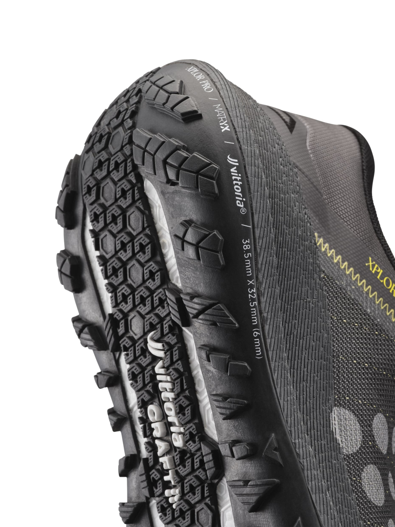 Tato propracovaná bota disponuje jedinečnými vlastnostmi, díky nimž se na asfaltu cítíte jako v silniční botě, zatímco v trailu vás nezklame svým komfortem, trakcí a stabilitou. Tkaný svršek této inovativní boty vyniká textilií Matryx® od společnosti Chamatex. Tato špičková technologie zahrnuje potažená, extrémně pevná polyamidová vlákna vyztužená kevlarem pro maximální pevnosti, stabilitu a fixaci chodidla v botě. Výsledkem je jedinečný svršek, který je odolný, lehký a drží chodidlo bezpečně na místě i během strmých a rychlých seběhů. Co však Xplor Pro Matryx skutečně odlišuje, je integrace technologie závodních plášťů Vittoria, které již několikrát uspěly na světových šampionátech. Tento inovativní design, inspirovaný dezény plášťů Terreno Dry a Terreno Mix, poskytuje výjimečnou trakci a odolnost v jakémkoli terénu díky okrajům ve tvaru rybích šupin a progresivnímu lamelování, optimalizovanému pro maximální rychlost tam, kde končí typický městský podklad. Pro příjemnější pocit z běhu je mezipodešev vybavena měkčí verzí pěny Px Foam™. Pevný a bezpečný fit boty navíc fixuje chodilo v botě i při intenzivním běhu v kopcovitém terénu.