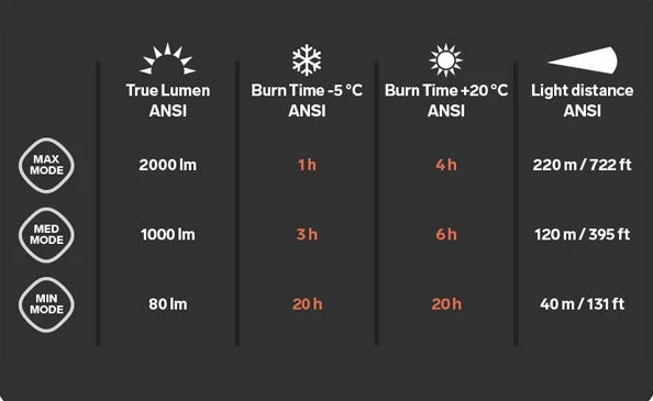 Čelová lampa s úctyhodným světelným tokem 2000 lumenů a s boost módem, který po omezenou dobu poskytuje výkon až 2300 lumenů. Čelovka Silva Exceed 4R je určena pro nejnáročnější outdoorové a sportovní aktivity při potřebě co nejnižší hmotnosti. Celková hmotnost čelovky i s baterií je pouze 258g. Technologie Intelligent Light kombinující široký světelný kužel a daleký dosvit až 220 metrů. 4 světelné režimy. Indikace kapacity baterie. Součástí balení je USB-C nabíjecí baterie Li-Ion 3,5Ah s obalem pro různá uchycení a ergonomická čelenka s držákem na baterii. Možnost zapínání / vypínaní v rukavicích díky velkému tlačítku. Nabíjení přes USB-C či klasickou zásuvku. Technická specifikace: Flow Light™ Intelligent Light™ Světelný výkon / dosvit: 2000 lumen / 220 m Čas výdrže baterie na jedno nabití při +20°C: 4 h (nejvyšší režim) / 20 h (úsporný režim) Typ baterie: Li-Ion 7,2V 3,5Ah Voděodolnost: IPX5 Teplotní rozsah pro použití lampy: -20°C až +60°C Hmotnost: 129g bez baterie / 258g s baterií Indikace nízké kapacity baterie Napájecí USB-C kabel