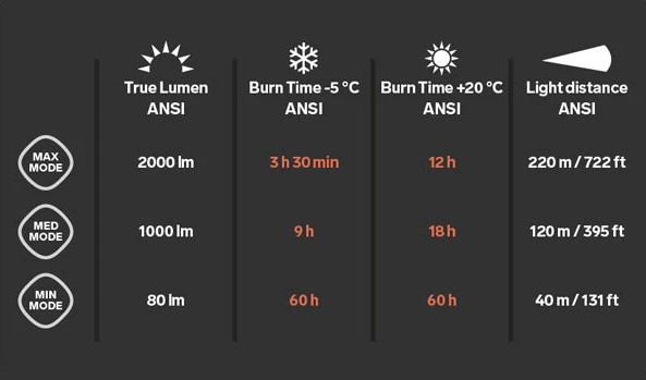 Čelová lampa s úctyhodným světelným tokem 2000 lumenů a s boost módem, který po omezenou dobu poskytuje výkon až 2300 lumenů. Čelovka Silva Exceed 4XT je určena pro nejnáročnější outdoorové a sportovní aktivity. Technologie Intelligent Light kombinující široký světelný kužel a daleký dosvit až 220 metrů. 4 světelné režimy. Indikace kapacity baterie. Nabíjecí baterie Li-Ion 10,5Ah s obalem pro různá uchycení, prodlužovací kabel s možností uložení baterie do batohu, na rám kola apod., ergonomická čelenka, speciální držák pro připevnění na helmu a speciální držák na rám kola - to vše je součástí praktického balení. Možnost zapínání / vypínaní v rukavicích díky velkému tlačítku. Nabíjení přes USB-C či klasickou zásuvku. Technická specifikace: Flow Light™ Intelligent Light™ Světelný výkon / dosvit: 2000 lumenů / 220 m Čas výdrže baterie na jedno nabití při +20°C: 12 h (nejvyšší režim) / 60 h (úsporný režim) Typ baterie: Li-Ion 7,2V 10,5Ah Voděodolnost: IPX5 Teplotní rozsah pro použití lampy: -20°C až +60°C Hmotnost: 129g bez baterie / 459g s baterií Indikace nízké kapacity baterie Držáky na kolo a helmu Napájecí USB-C kabel