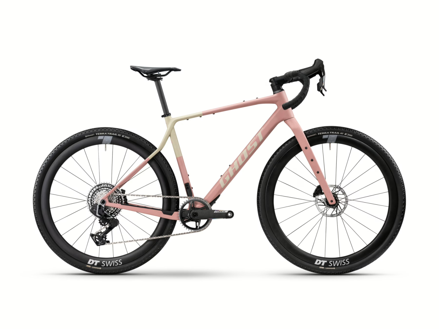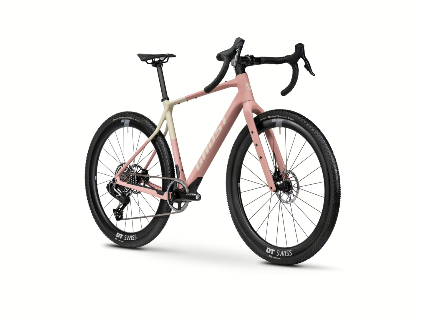 - Asket CF X: Růžový rám pohání 13rychlostní elektrická sada SRAM XPLR AXS a karbonovými koly DT Swiss GRC 1600 SP.