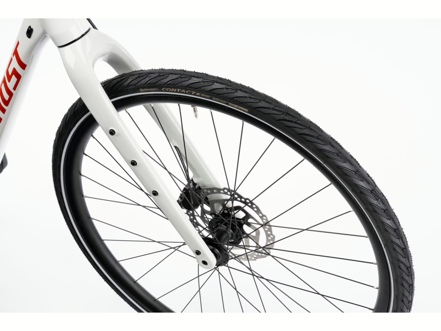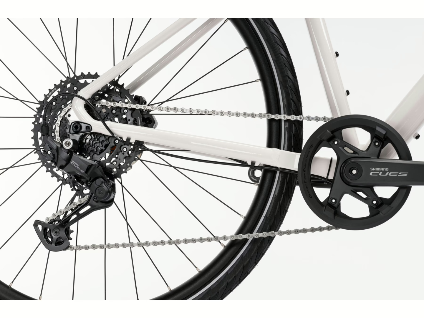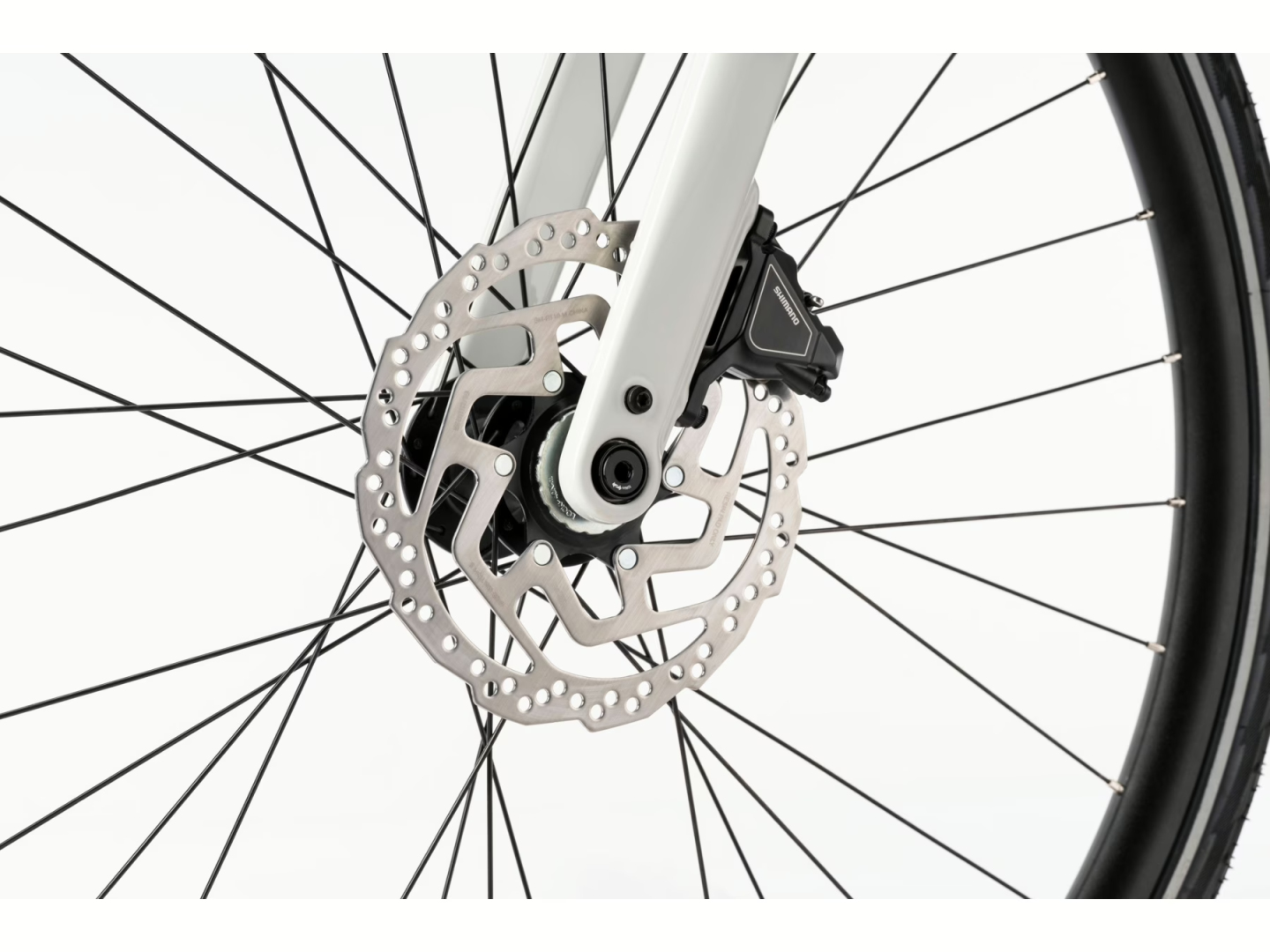 Pohon tvoří sada Shimano CUES U4000 1×10 s technologií LINKGLIDE, která byla vyvinuta speciálně pro dlouhou životnost a hladké řazení i pod zátěží. Komponenty CUES jsou robustní, přesné a nenáročné na údržbu, což z nich dělá ideální a ekonomickou volbu pro každodenní použití — ať už při dojíždění, tréninku nebo rekreační jízdě. Spolehlivé hydraulické kotoučové brzdy Shimano zaručují jistý výkon za všech podmínek a jsou doplněny osvědčenými plášti Continental Contact s reflexními prvky.