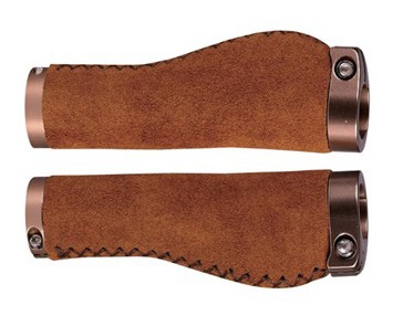 Gripy LEDER jsou anatomicky tvarované ze semišové kůže v retro stylu, hnědé se zámky na obou stranách, délka 137 mm.
