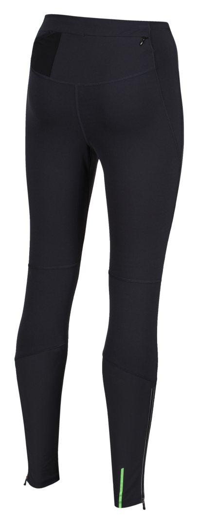 Pevný materiál dlouhých dámských elasťáků nabídne vysoký komfort, odolnost a tepelný komfort. Perfektní, atletický a anatomický střih kalhot je složen z několika dílů, které podporují přirozený pohyb. I přes použití plochých švů je velmi dobře řešen rozkrok, kde žádné švy nezasahují do míst, kde dochází k výraznému tření. Stahování v pase je řešeno poměrně široký, pásem, ve kterém je vložena stahovací guma. Zadní díl obshuje větší kapsu na zip, ve které je všita gumička na uchycení klíčů. Na tuto kapsu navazuje menší, prodyšná kapsička ukončená elastickou manžetou. Zadní díl má z vnitřní strany silikonový pásek pro lepší uchycení kalhoty na těle. Zadní lýtkový díl je vyroben z pevnějšího polyamidu, má tedy menší elasticitu a naopak větší odolnost. Na vnější straně lýtek jsou zipy, které mají navíc reflexní podtisk. Samozřejmostí jsou další reflexní potisky.