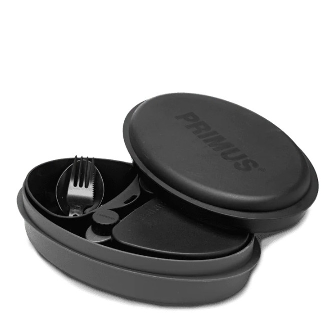 Jídelní set PRIMUS je dokonalá sada na servírování a cestování se vším, co potřebujete k tomu, abyste si své oblíbené jídlo připravili a dokonale vychutnali venku v přírodě, ale šikne se i během pracovního dne. Oddělte jednotlivé položky menu a uložte si ingredience stranou. Tato osmidílná sada obsahuje dvě hluboké misky, menší úložnou nádobu s pevně přiléhajícím víkem, dózu na tři druhy koření, malou nádobu na tekutiny (např.olivový olej...), hrnek, skládací spork (lžíce s vidličkou dohromady) a prkénko na krájení, cedník a struhadlo v jednom. K dispozici ve třech barvách, černé, červené a tmavě zelené. Není určeno pro servírování horkých potravin a nápojů.