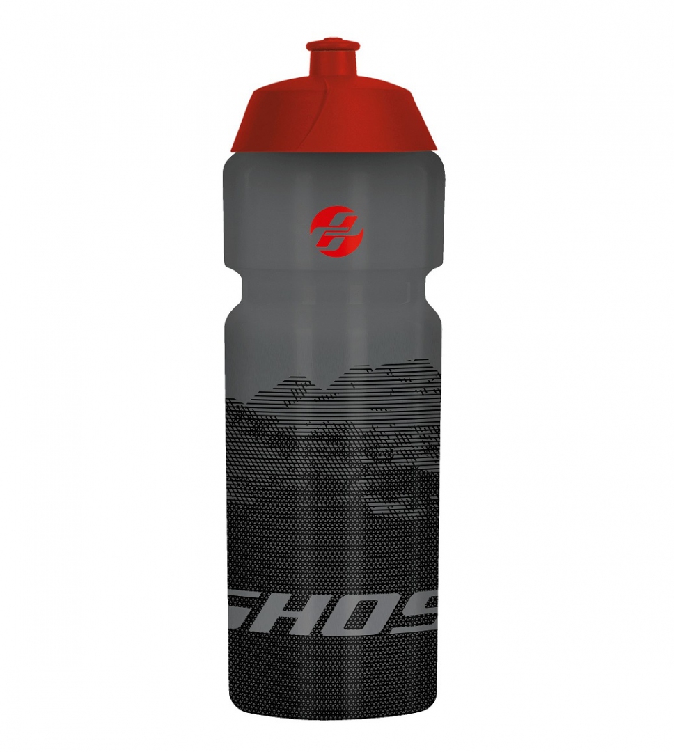Tmavě šedá (skoro černá) cyklo láhev Ghost o objemu 0,75l s černým potiskem, 100% recyklovatelná, bez obsahu BPA.