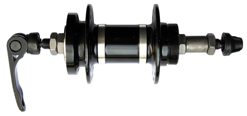 AL zadní náboj, rychloupínací osa včetně táhla uložená v průmyslových ložiskách, pro kotoučové brzdy s uchycením na 6 děr, pro závitové kolečko 6 a 7 speed, 32 děr pro dráty, barva černá