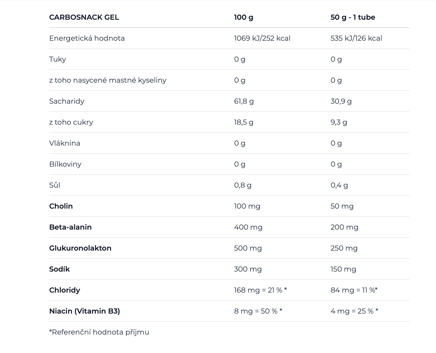 CARBOSNACK příchuť citron: 49 % maltodextrin, voda, 15 % fruktóza, citronan sodný, regulátor kyselosti kyselina citronová, glukuronolakton, beta-alanin, regulátor kyselosti kyselina vinná, cholin L-bitartrát, chlorid sodný, konzervant benzoan sodný, aroma, konzervant kyselina sorbová, nikotinamid, sladidlo steviol-glykosidy.