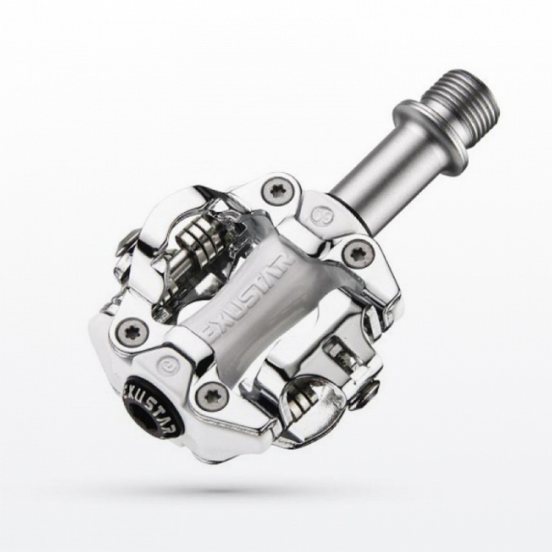 Bílé nášlapné MTB pedály Exustar E-PM213-WH mají odolné hliníkové tělo s osou CrMo a tenkým dvojitým ložiskovým systémem. Kufry EPS-M jsou kompatibilní se systémem Shimano MTB. Tenzometr (měřič odporu) umožňuje přesné nastavení síly odporu. CrMo osa je obráběná CNC.