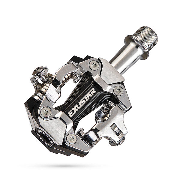 MTB nášlapné pedály černé barvy Exustar E-PM230 mají lehké a odolné tělo z extrudovaného hliníku s osou CrMo a tenkým dvojitým ložiskovým systémem. Kufry EPS-M jsou kompatibilní se systémem Shimano MTB. Tenzometr umožňuje přesné nastavení síly odporu.