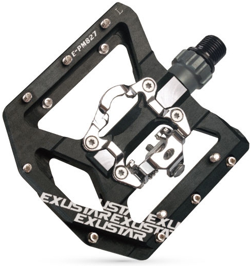 Nízkoprofilové MTB pedály Exustar E-PM827 s hliníkovou platformou opatřenou protiskluzovými piny. Tělo pedálu je z extrudovaného hliníku, zapouzdřené CrMo osy a dvojitého ložiskového systému LSL. Kufry jsou jednostranné typu EPS-M (kompatibilní s Shimano MTB).