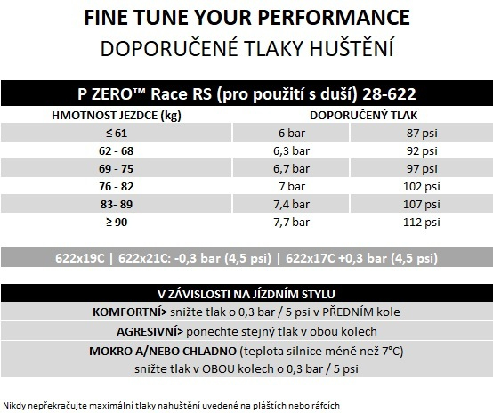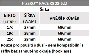 P ZERO™ Race RS je nejvýkonnější plášť v naší řadě P ZERO™ Race, dostupný ve verzích TLR i pro použití s duší. Využívá nejnovější technologie vyvinuté ve spolupráci s profesionálními závodníky z našich týmů World Tour, díky čemuž je rychlejší, lehčí a přilnavější než univerzálnější P ZERO™ Race. Tento výkonnostní skok umožňuje inovativní gumová směs SmartEVO2 – nejpokročilejší směs Pirelli, která přináší výjimečnou přilnavost a výkon. Verze P ZERO™ Race RS pro použití s duší dosahuje nejlepších výsledků v kombinaci s naší ultralehkou TPU duší SmarTUBE, která zajišťuje špičkový výkon a rekordně nízkou hmotnost celého systému.