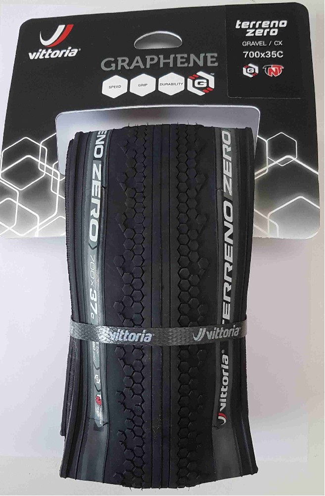 Terreno Zero je ideální plášť pro Gravel kola. Centrální běhou je inspirován nejrychlejší pneumatikou Corsa, aby přesun po silnici probíhal co nejhladšeji a nejrychleji, ale na bocích běhounu jsou šestihranné "konflíky", které zajišťují dobrý záběr na nezpevněných cestách (štěrk, hlína). Terreno Zero používá směs Vittoria Graphene . Tento revoluční materiál umožňuje odstraňování přírodních materiálů z gumy. To znamená, že již není třeba dělat kompromisy mezi rychlostí, přilnavostí, odolností a odolností proti propíchnutí. Vittoria je jediný výrobce pneumatik, který používá Graphene pro výrobu pneumatik.
