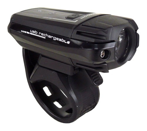 přední světlo s 1x LED o svítivosti 100 lm, indikátor vybití akumulátoru, nabíjecí přes USB, součástí světla je držák na řidítka