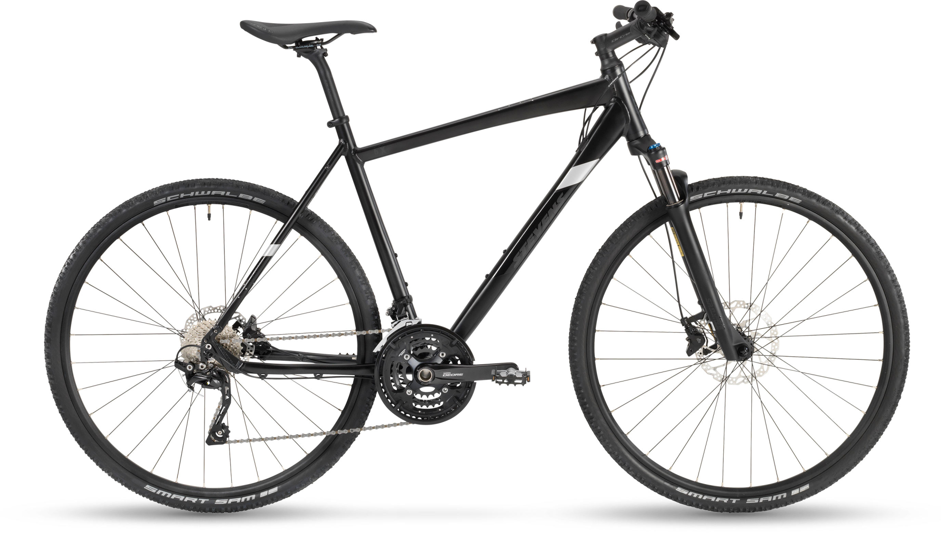 Brzdný výkon zajišťují spolehlivé hydraulické kotoučové brzdy Shimano BR-MT410 s kotouči 180/160 mm. Kolo je obuto do univerzálních plášťů Schwalbe Smart Sam v šířce 42 mm, které zvládnou asfalt i zpevněné cesty s jistým záběrem a minimálním valivým odporem.