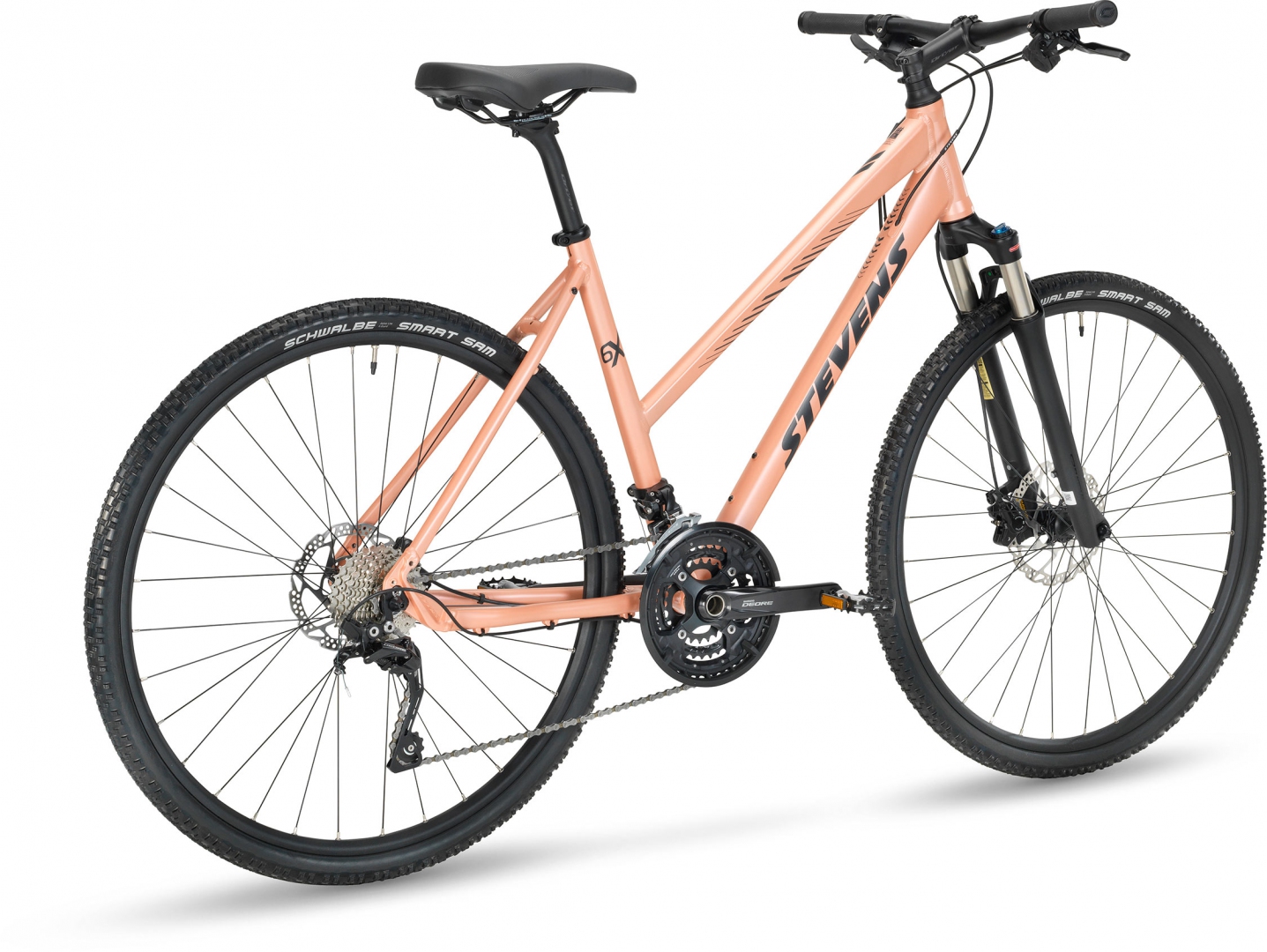 Hodnotně vybavené krosové kolo, které letos přijíždí s ještě lepším pohonem. Stačilo rozšířit zadní stavbu odolného hliníkového rámu a Stevens 6X nově dokáže pojmout desetirychlostní kazetu. Výsledkem je sada Shimano Deore 3x10, s níž budete na cyklostezkách, v lehkém terénu i ve městě nedostižitelní. Krosový 6X kromě rychlosti nezapomíná ani na komfort díky vhodně zvolenému posedu Oxygen a odpružené vidlici SR Suntour s olejovým tlumením. Jistotu vám dodají hydraulické kotoučové brzdy a přilnavé pláště Schwalbe Smart Sam Performance.