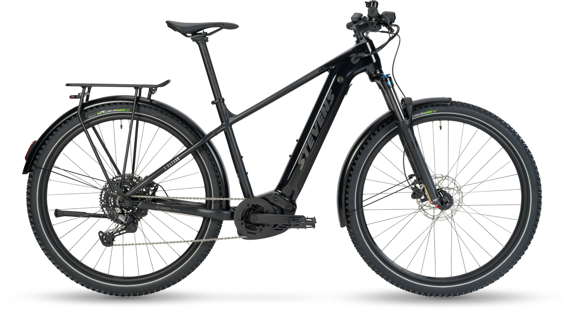 STEVENS E-Hazard FEQ Stealth Black spojuje pohodlný posed a stabilní 29″ kola s lehkým hliníkovým rámem a odpruženou vidlicí SR Suntour XCR34 se 120mm zdvihem. Díky tomu spolehlivě zvládá nerovnosti městských cest i zpevněné stezky a hodí se pro delší výlety s plnou výbavou.