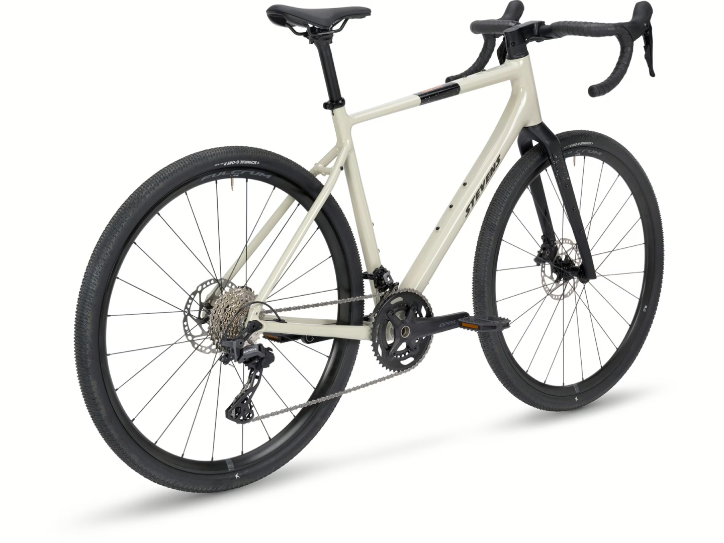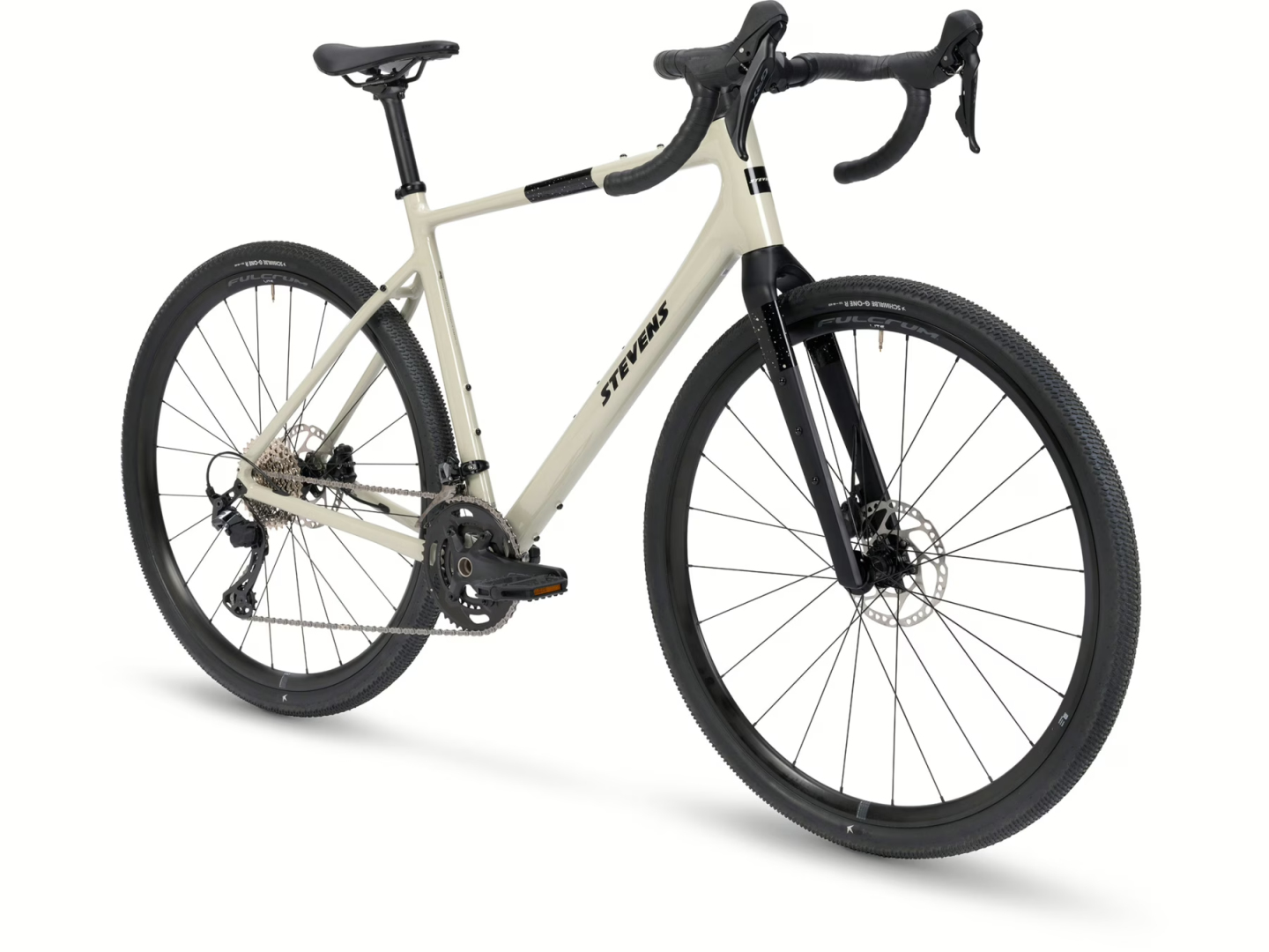 STEVENS Gavere Com v elegantním odstínu Cloudy Beige spojuje komfort, stabilitu a precizní ovládání v moderním gravelovém pojetí. Nově vyvinutý rám z hliníku 6061 je lehký, tuhý a připravený na jakýkoli terén, zatímco celokarbonová vidlice STEVENS Full Carbon SL účinně tlumí vibrace a přispívá k vysoké jízdní jistotě.