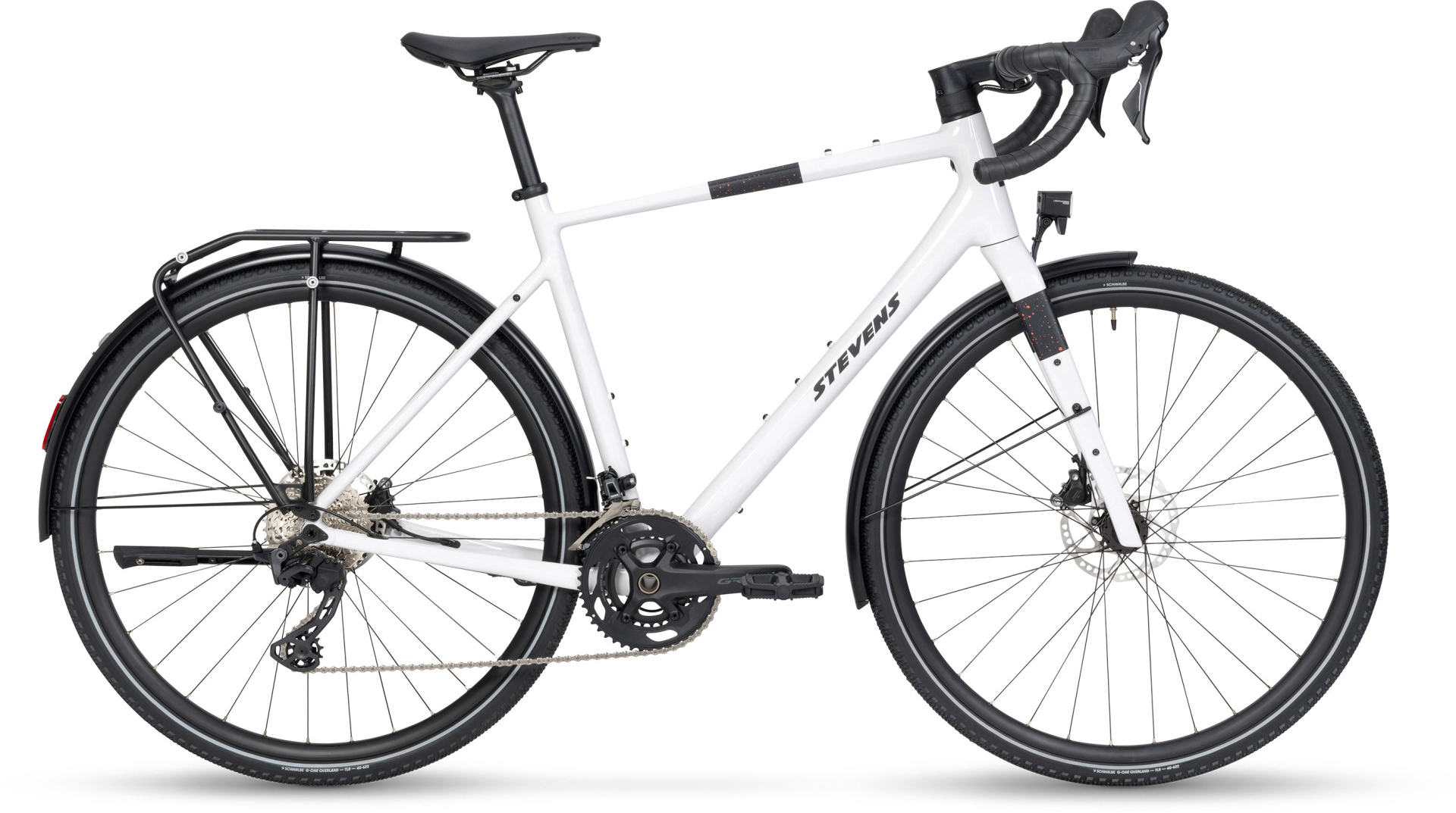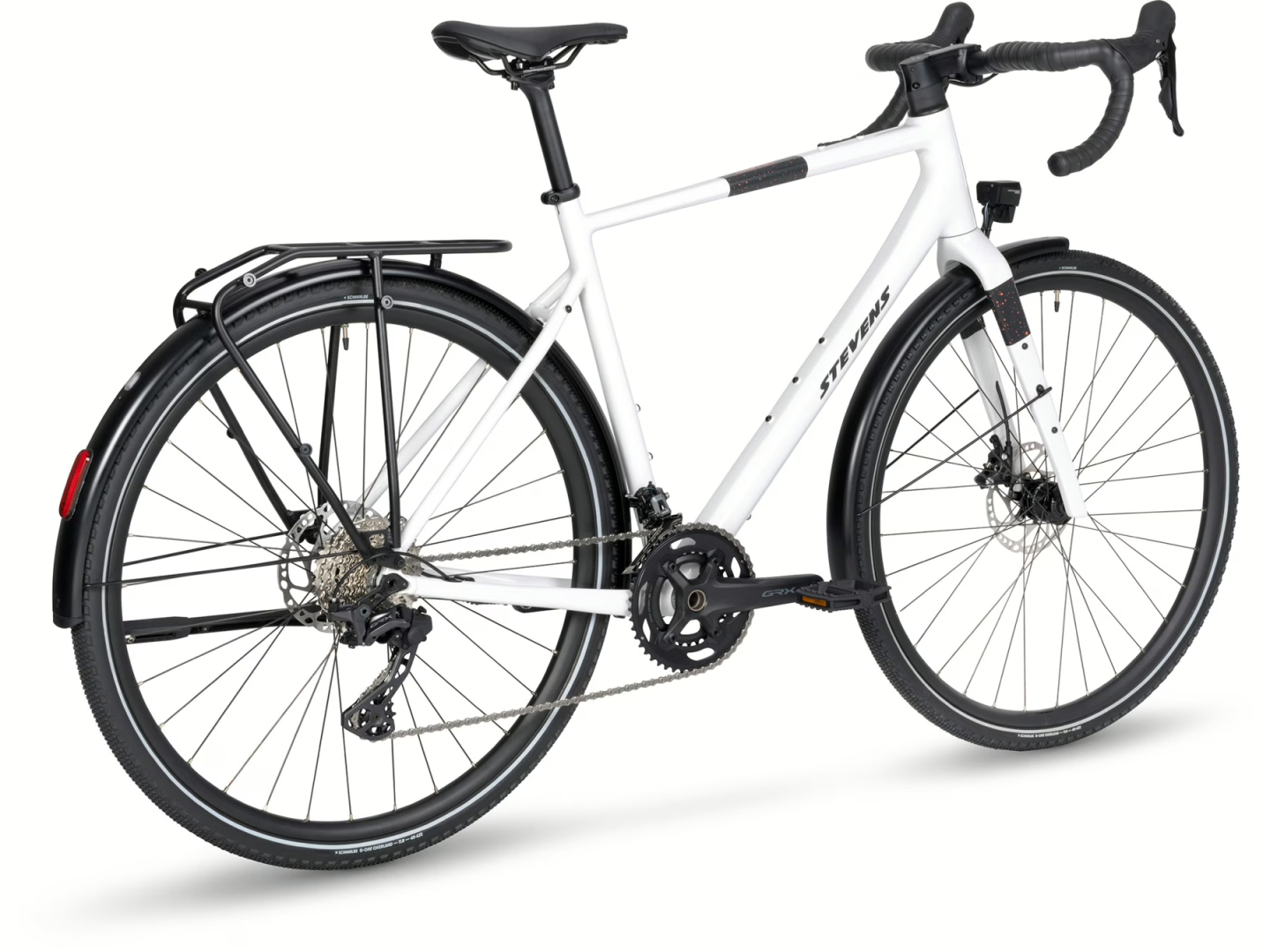 Kola s ráfky Oxygen G25 Disc a náboji Formula RXC-400 / Shutter Precision PL-7 jsou obuta do univerzálních plášťů Schwalbe G-One Overland Performance o šířce 40 mm – ideálních pro kombinaci asfaltu, štěrku i polních cest.