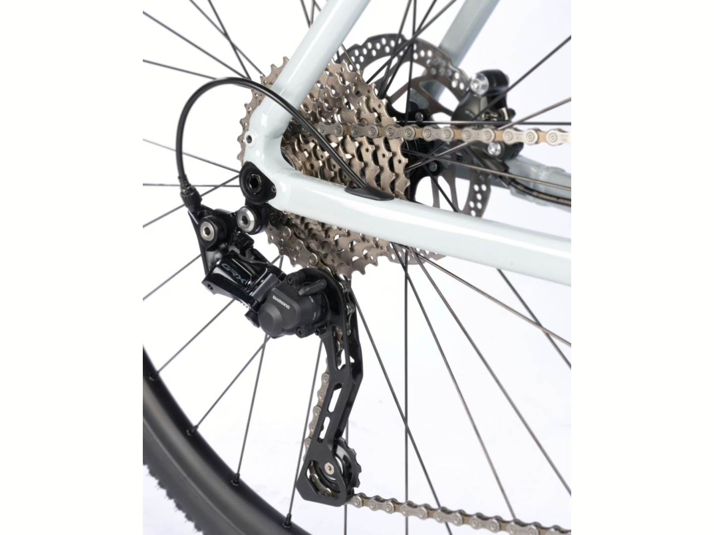 Pohon zajišťuje spolehlivá gravelová sada Shimano GRX 400 2×10, která nabízí přesné a hladké řazení v každé situaci. Brzdný výkon přinášejí hydraulické kotoučové brzdy Shimano Tiagra, které garantují jistotu a kontrolu i za nepříznivého počasí.