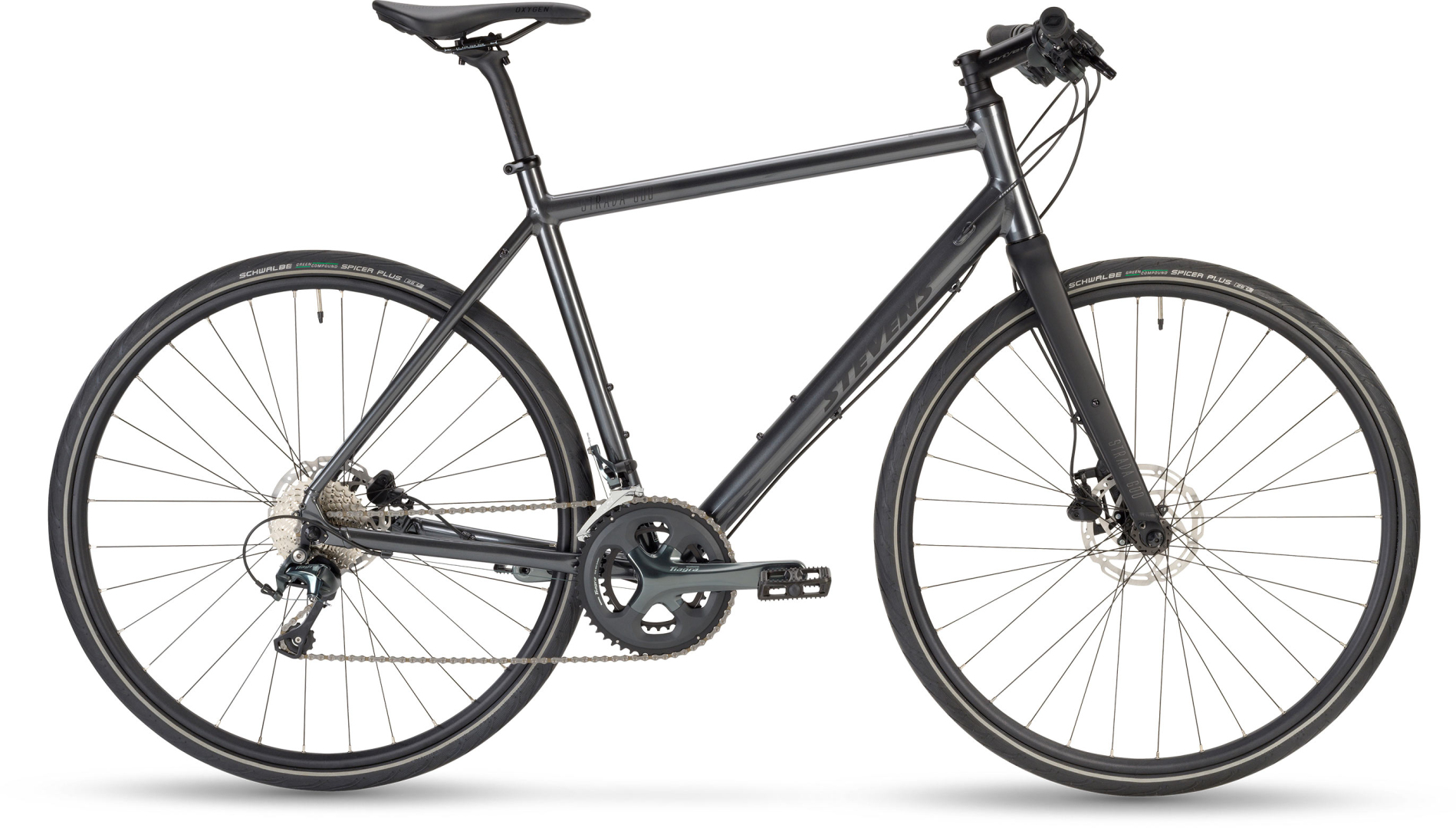 Kolo je obuto do plášťů Schwalbe Spicer Plus šířky 35 mm – ideálních pro komfortní a rychlou jízdu po asfaltu i cyklostezkách. Elegantní barevné provedení Phantom Grey podtrhuje čistý a funkční design kola.