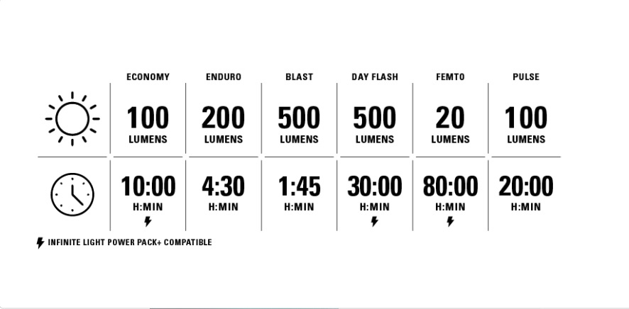 Přední světlo Classic Drive+ s výkonem 500 Lumenů, má lehké a odolné CNC opracované tělo s výřezy pro boční viditelnost. Superinteligentní indikátor umožňuje kontrolovat uživateli hladinu výkonu až do konce. Světlo má až 6 režimů svícení a blikání. Funkce režimu paměti, kdy se po vypnutí vrátí do naposledy zvoleného režimu. Vysokorychlostní nabíjení přes USB. Možnost uchycení na řidítka nebo na přilbu. Specifikace: Režimy: 6 módů svícení nebo blikání Svítivost: až 500 Lm Doba svícení: viz další obrázek Vodotěsnost: ano Indikátor stavu baterie: ano Vodotěsnost: ano Hmotnost: 95g