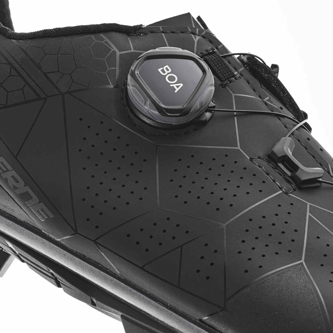 3883-001 G.EDGE jsou MTB boty pro ty, kteří chtějí maximálně využít každý kilometr na štěrku, svazích a všem mezi tím. Tyto boty, které jsou navrženy tak, aby dokonale spojovaly výkon a pohodlí, jsou ideální pro cyklisty hledající funkční produkt. Mikrovláknový materiál je strategicky perforován po celé horní části, aby optimalizoval prodyšnost a zlepšil větrání, takže vaše nohy zůstanou během jízdy v suchu a chladu. Systém zapínání, vybavený mikro-nastavitelným kolečkem BOA L6 DIAL C a 5 vodítky tkaniček, zajišťuje rovnoměrné a bezpečné zapínání bez jakýchkoli tlakových bodů. COMFORT FIT TONGUE obsahuje high-tech polstrovací vrstvu pro větší pohodlí a prodyšnost. Integrovaná protiskluzová pata zvyšuje stabilitu a kontrolu nohy pro lepší zážitek z jízdy. Vložka EPS TRANSPIRANT INSOLE s anatomickou podporou pro pohodlí a efektivitu šlapání. MTB 2DENSITY SOLE je speciálně navržená podrážka pro milovníky horských kol. Je vyrobena ze směsi nylonu a sklelných vláken, díky čemuž dosahuje pozoruhodné rovnováhy mezi odolností a lehkostí. Dezén je pečlivě navržen tak, aby poskytoval optimální přilnavost a stabilitu a vyznačoval se vynikající odolností v různých terénech. Pro zvýšení přizpůsobivosti jsou v přední části umístěny dva odnímatelné hroty, které zlepšují trakci, zejména v náročném a blátivém terénu.