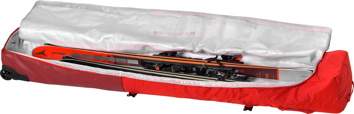 Vak na lyže na kolečkách Atomic RS Ski Wheelie 4 Pairs je ideální pro závodníky a profesionály, kteří cestují s mnoha lyžemi. Obal je odolný proti opotřebení, vnější materiál je odolný proti vodě a skvrnám a podšívka z odolné plachtoviny se snadno čistí. Vejdou se do něj nejméně 4 páry lyží – a podle šířky až šest párů, přičemž všechny jsou chráněny tak, aby vázání jedné lyže nepoškrábalo povrch jiné. Polstrované kompresní popruhy navíc umožňují zabalit lyže pevně a bezpečně. Má přední držadlo pro jízdu na kolečkách a další držadla, takže s plně naloženým vakem mohou manipulovat dvě osoby, a tichá, 8,5 cm velká kolečka, která usnadňují manévrování i s plně naloženým vakem.