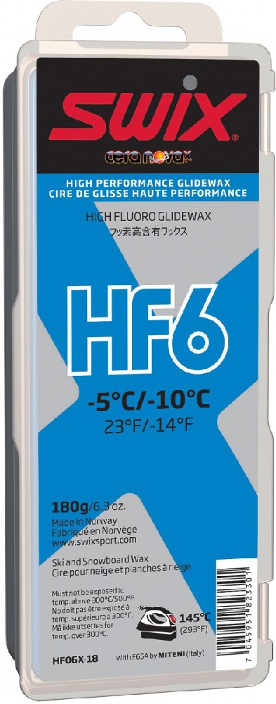 Naše standardní receptura vosku HF6 se ukázala jako příliš dobrá, abychom ji vyřadili, a proto pokračuje v nové řadě Cera Nova X jako HF06X. Jde o velmi oblíbený vosk jak ve sjezdovém, tak běžeckém lyžování a funguje perfektně na umělém sněhu, který je smíchaný se starším přeměněným přírodním sněhem. HF06X lze použít samostatně jako závodní vosk nebo jako základ pod práškový vosk Cera F, např. FC06X. Teplotní rozsah od -5°C do -10°C. Doporučená teplota zažehlování: 145°C.