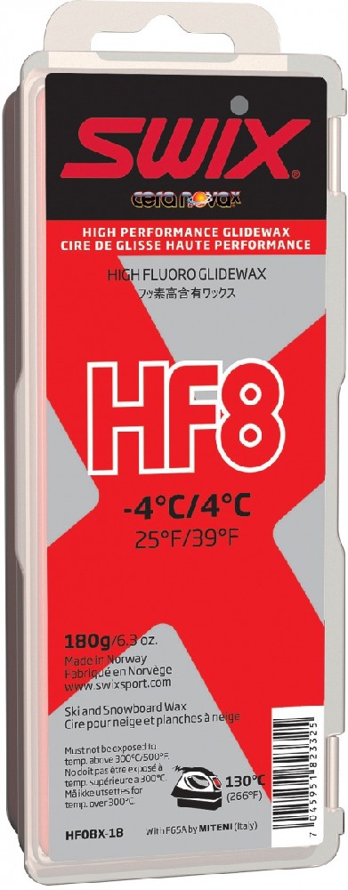 Pokračování klasického vosku HF8, který je legendou mezi závodními vosky. Během posledních deseti let se tento vosk podílel na řadě vítězství na Olympijských hrách a Světových pohárech napříč lyžařskými disciplínami. Jeho měkkost a vysoký obsah fluoru poskytuje vysokou výkonnost okolo bodu mrazu. HF08X lze použít samostatně jako závodní vosk nebo jako základ pod práškový vosk Cera F, např. FC08X. Teplotní rozsah od -4°C do 4°C. Doporučená teplota zažehlování: 130°C.