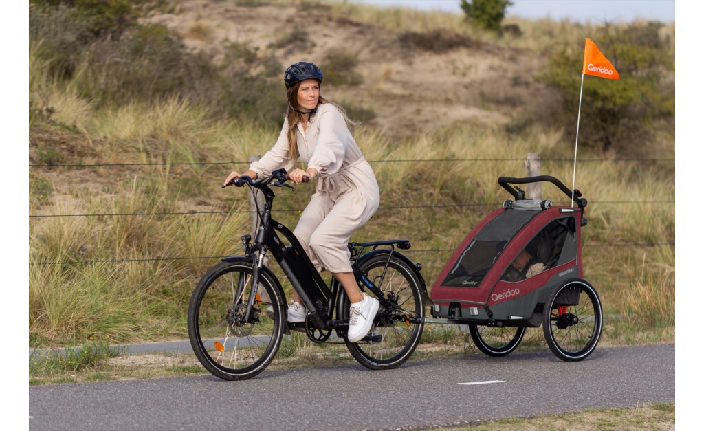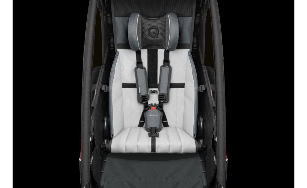 Jednomístný odpružený dětský vozík za kolo Qeridoo Sportrex 1. Komfortní sedadlo s adaptivním 5-bodovým pásem.