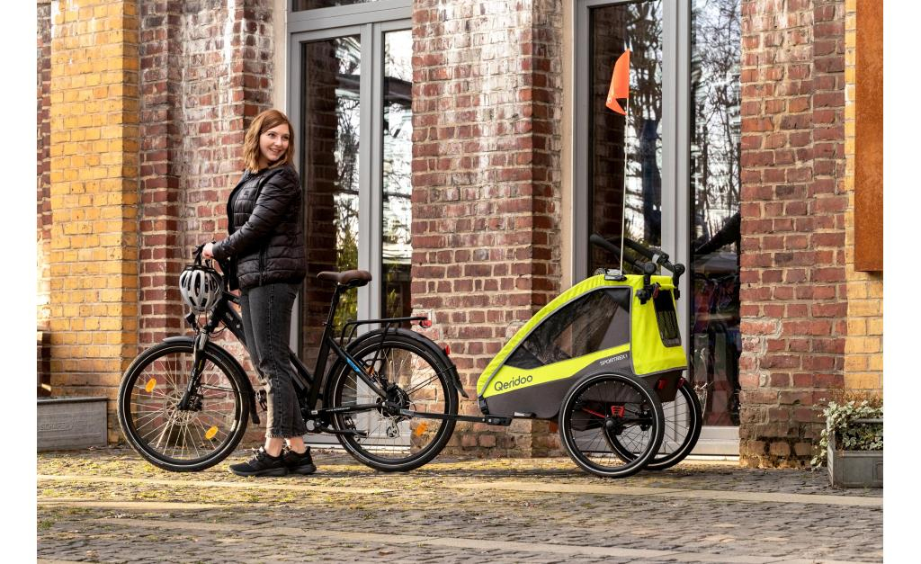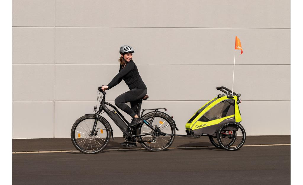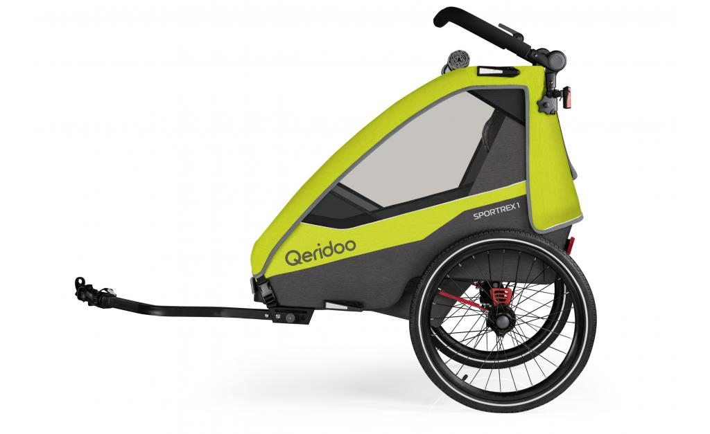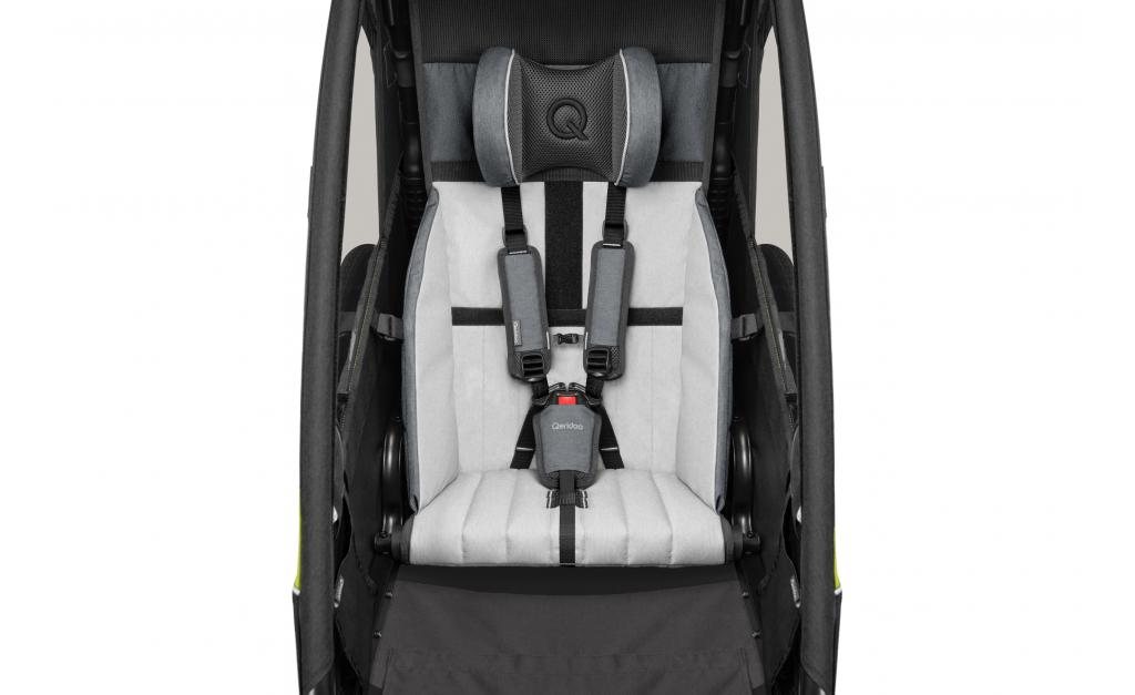 Jednomístný odpružený dětský vozík za kolo Qeridoo Sportrex 1. Komfortní sedadlo s adaptivním 5-bodovým pásem.