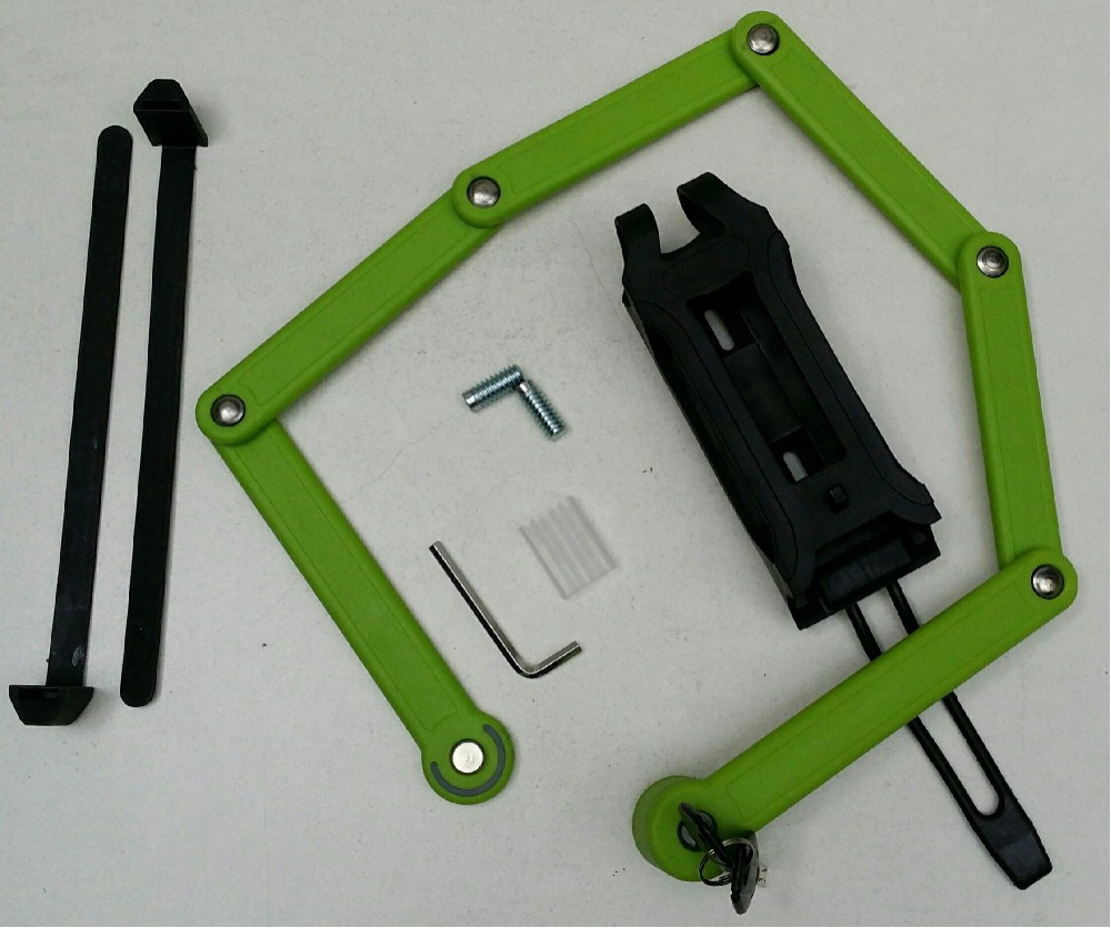 plochý článkový zámek, 6 ocelových článků potažených plastem, vložka s bočními stavítky, délka 840mm, zámek ve složeném stavu 188x54mm, plastový držák pro montáž na rám, barva zelená, hmotnost 850g